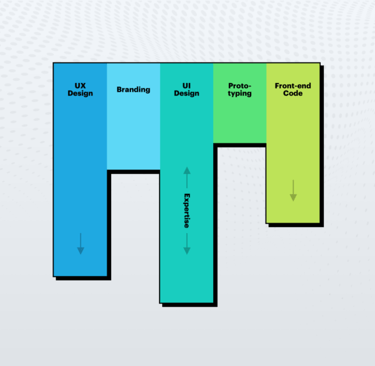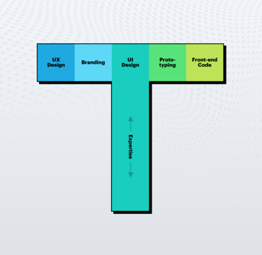 “T-shaped” là cấp độ trưởng thành tiếp theo. Chữ “T” có một trụ dọc (sâu) và một nhánh ngang (rộng), thể hiện người có một kỹ năng mạnh, nhưng đồng thời hiểu biết cơ bản các lĩnh vực liên quan. Ví dụ: Một UI designer giỏi thiết kế giao diện, nhưng cũng hiểu UX, marketing, motion, và cách dev triển khai.